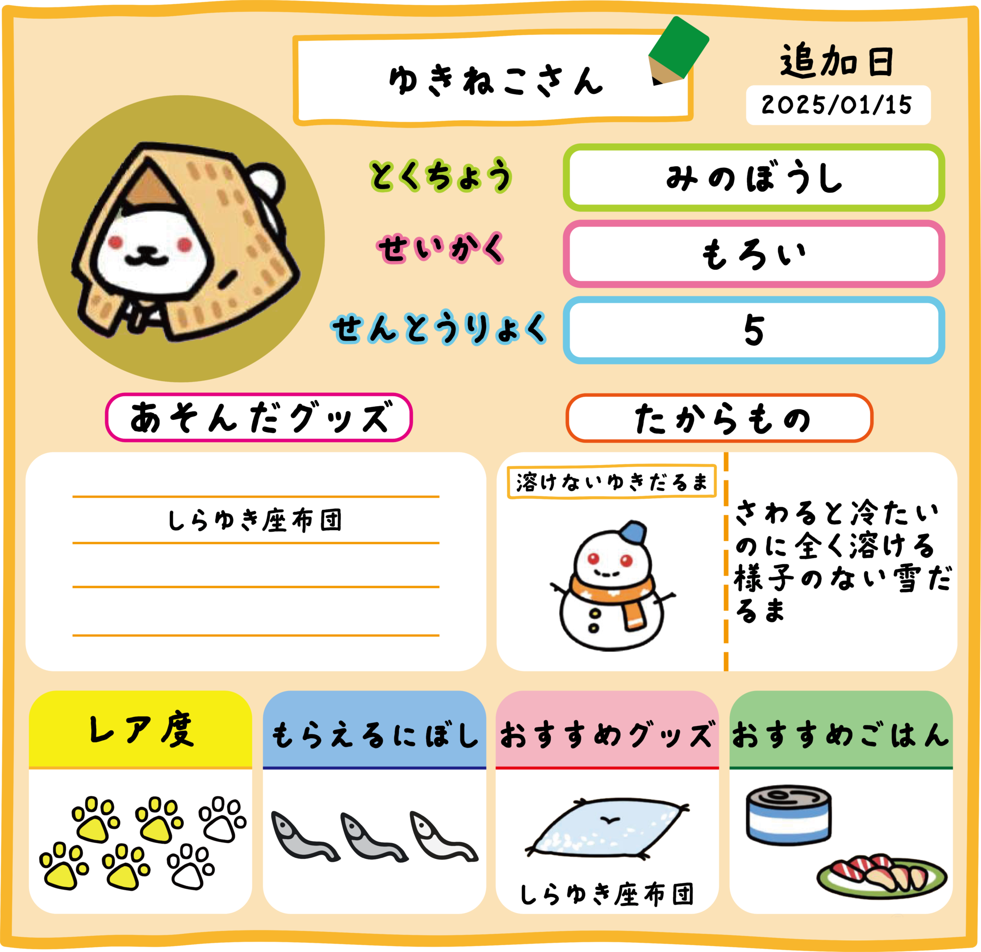 ・雪の降り始め(12/15)から、ゆきねこさんが出現するグッズとして、お座布団(黄)、ちりめん座布団、さくさ座布団、もみじ座布団、い草座布団(赤・青)、極冷アルミプレート、天然大理石プレート、テント・ブリザード、壷つき和箪笥、雪ソリが一時的に追加されますよ。